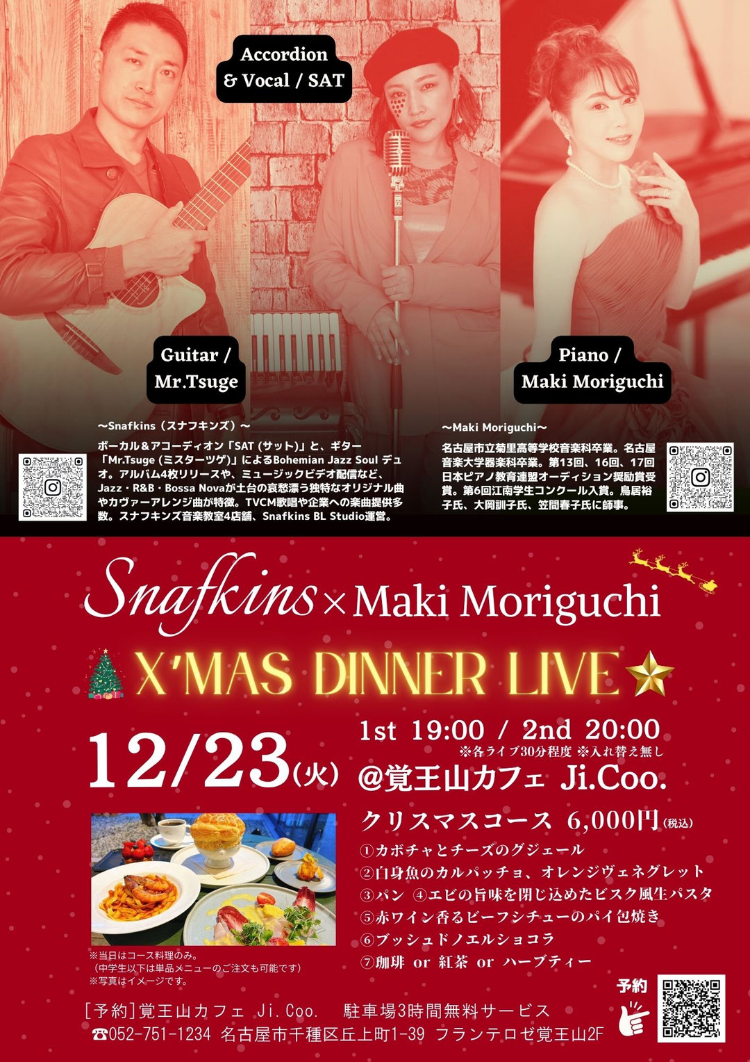 Live · 2025/12/23 覚王山カフェ Ji.Coo. X'masライブ開催決定! 大人気の覚王山カフェJi.Coo.でクリスマスライブ開催します。今回はスナフキンズ音楽教室ピアノ講師でもある森口真紀先生と共演。至福の夜をご堪能ください。 ◆12/23(火)開場19:00/開演20:00 Vo&Acco/ SAT Gt/ Mr.Tsuge Pf/ Maki Moriguchi 予約→https://forms.gle/iqJdAALCqRo45Aus6 tagPlaceholderカテゴリ: