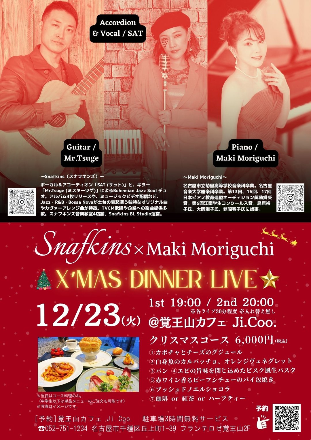 大人気の覚王山カフェJi.Coo.でクリスマスライブ開催します。今回はスナフキンズ音楽教室ピアノ講師でもある森口真紀先生と共演。至福の夜をご堪能ください。